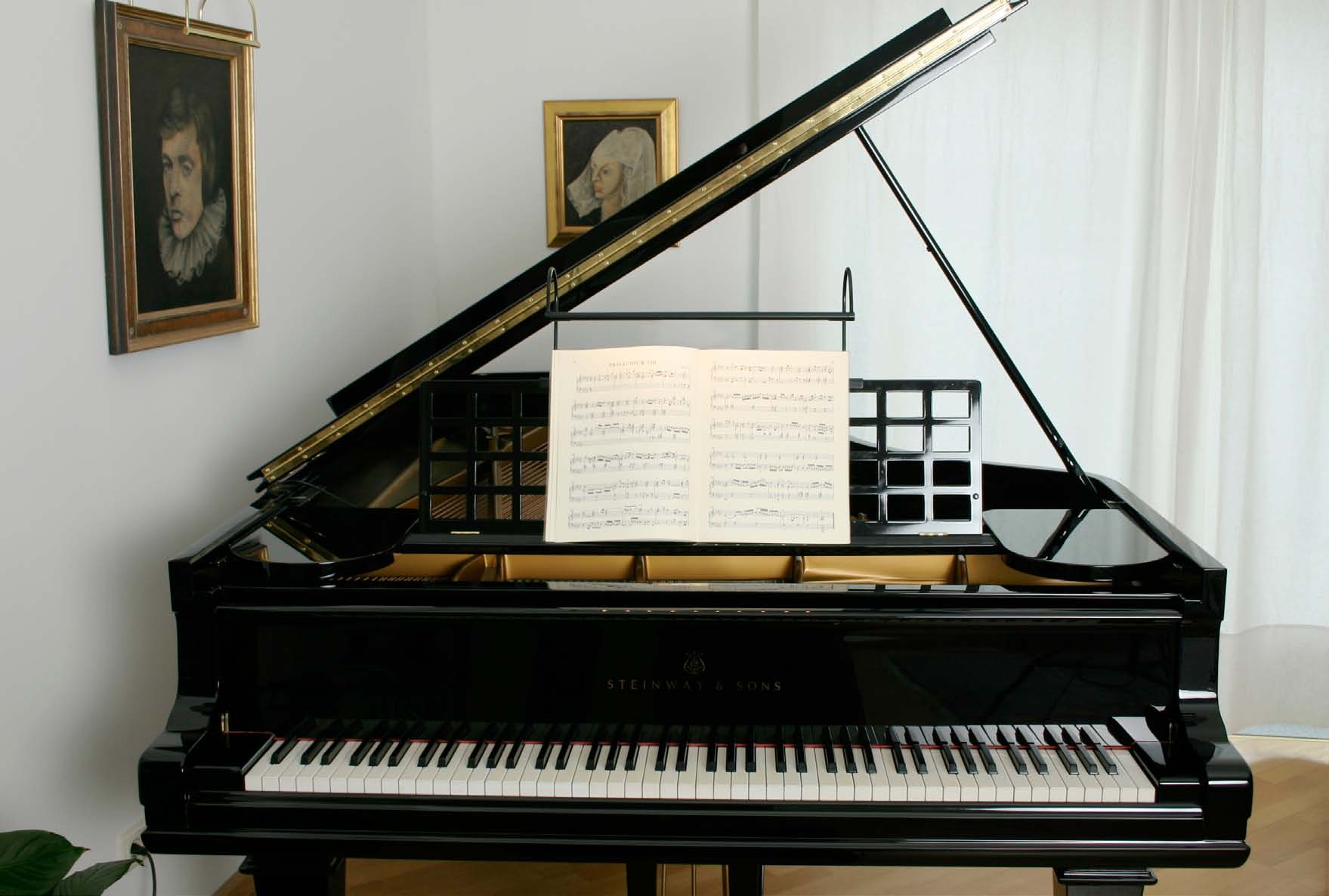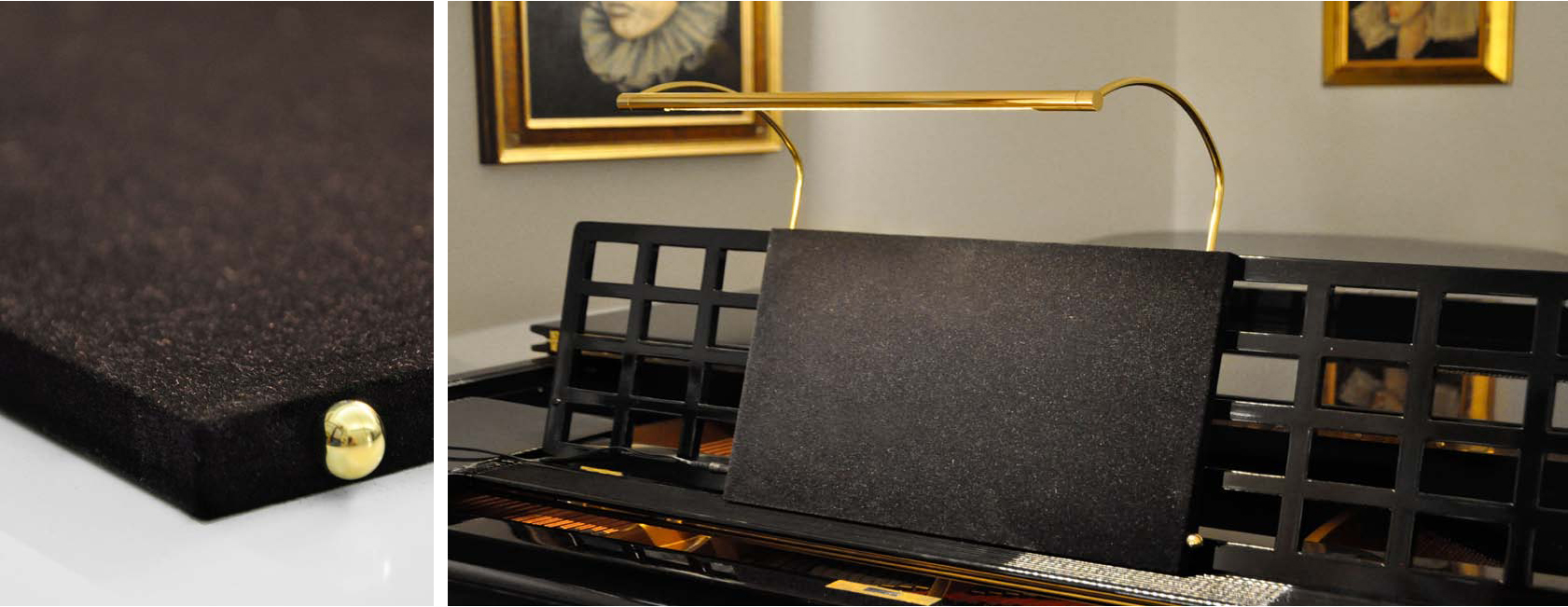 An organist needs proper lighting for sheet music. This light offers a solution for attachment to valuable instruments. The light is height-adjustable, mounted on a flocked board that serves as a music stand. A single power connection is located on the bass side of the keyboard. By unplugging the connector, the board with the light can be removed easily, allowing the grand piano to be closed. The light tube is rotatable, and the brightness can be adjusted by the pianist using the dimming sphere on the board.